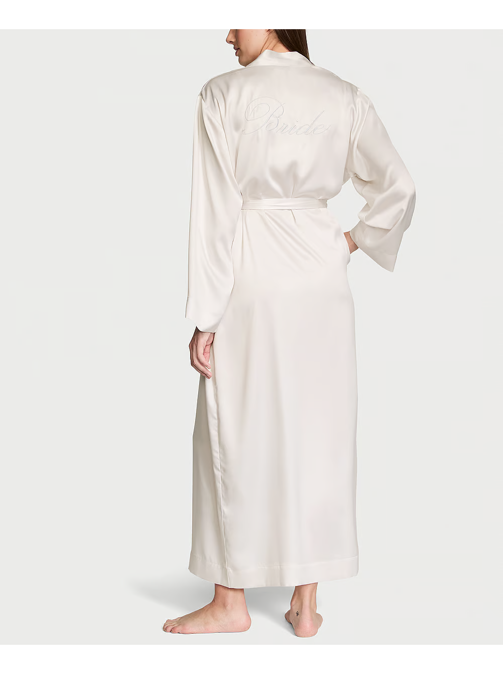 Халат виготовлений із атласної тканини. Представлена модель виконана у стилі кімоно. Колір: білий. Подовжена модель халата, довжина до п'ят